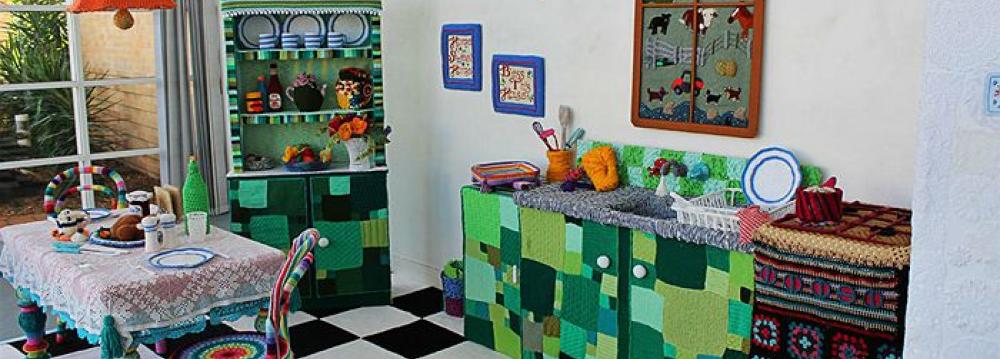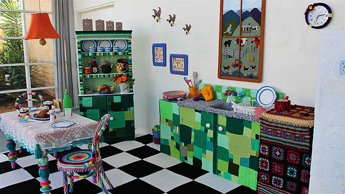 Knitters have transformed the foyer of the Warwick Art Gallery in Australia, into a kitchen “entirely knitted, crocheted, felted, woven, and wrapped in yarn,” said gallery director Karina Devine. “It’s our knitchen!”