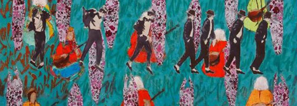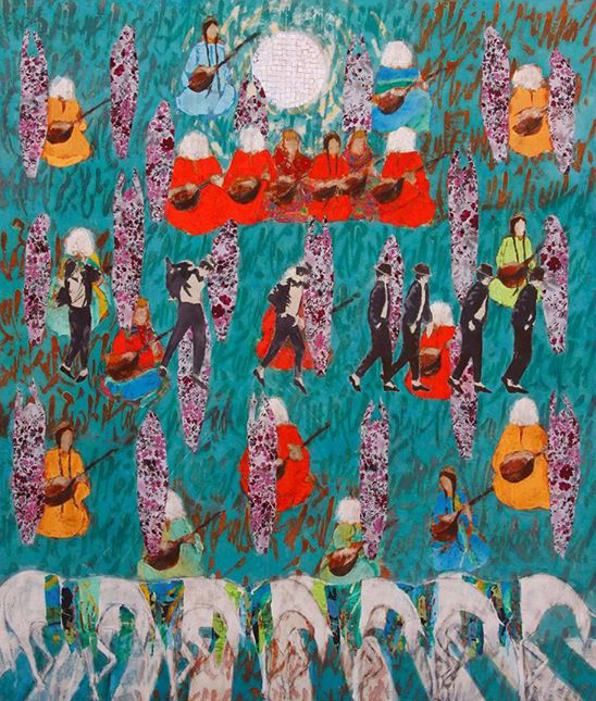 Inspired by the desert landscapes of his homeland, Tatari often uses the warm shades of orange and red to illustrate semi-abstract figures in traditional Persian ceremonies. He teaches fine arts at the University of Tehran.
