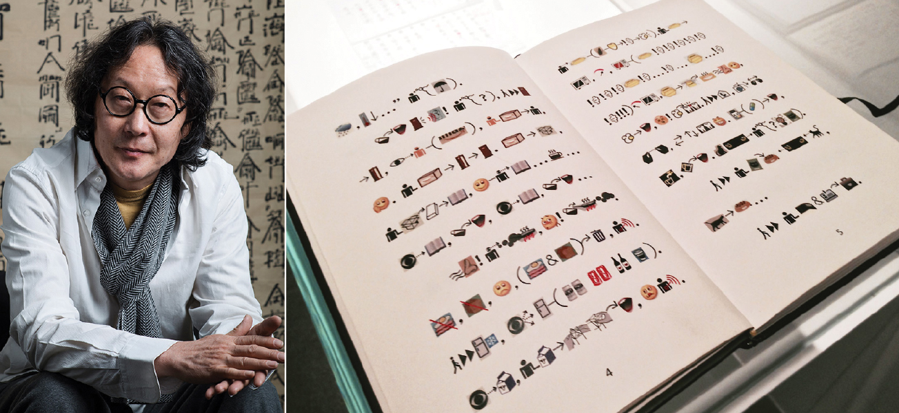 Xu Bing collected pre-existing logos that constitute a banal lingua franca of international travel and advertising, displayed in airports and other public spaces. In his hands, these familiar signs have turned into units of a new script, legible to speakers of any language, MIT Press said in a review of the book.