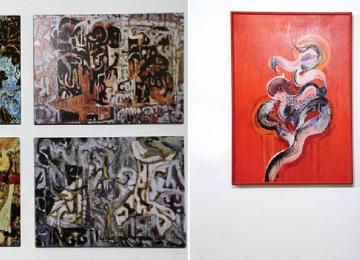 The exhibition features works with various mediums, predominantly large-…
